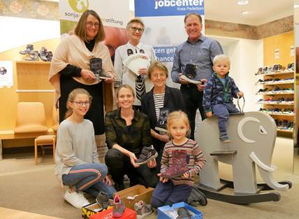 Foto: Leni, Karla und Jakob stöbern nach neuen Schuhen. Die Winterschuhaktion wird möglich gemacht durch (von links) Nicole Jucks (Jobcenter Kreis Paderborn), Angelika Klingenthal (Sonja-Reischmann-Stiftung), Christof Bernard (Schuhhaus Bernard), Mitte: Katrin Pomberg u. Inge Stümmler (Schuhhaus Lamskemper).