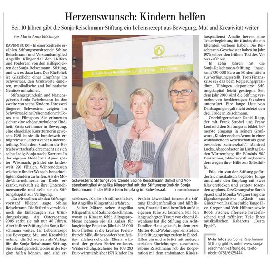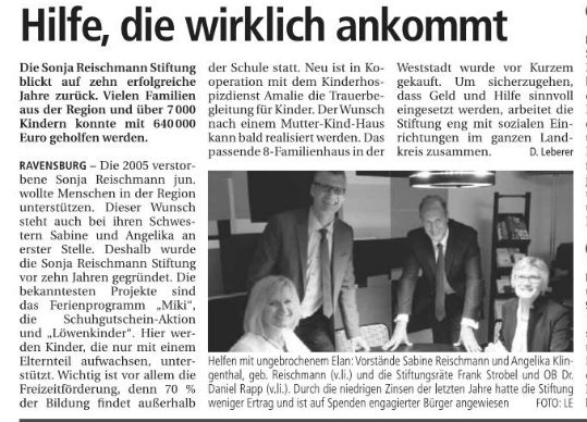 Ravensburger Sonja-Reischmann-Stiftung legt Jahresbericht für 2016 vor