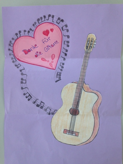 Im Juni hat sie nun endlich eine eigene (gebrauchte) Gitarre bekommen, finanziert durch eine Spende an die Sonja Reischmann Stiftung. Nun ist Üben und Spielen jederzeit und überall möglich.